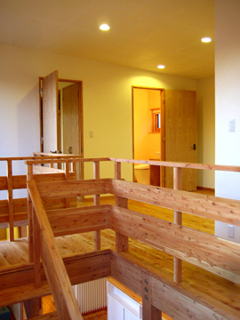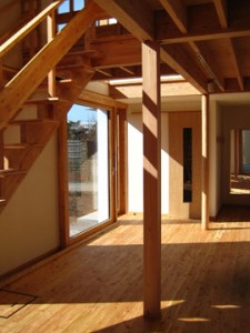 建築主の要望の4つの骨子である、「明るさ」「暖かさ」「一体感」そして「家族感」を実現するため、南西方向に面した吹抜け部分に、断熱性の高い大きな開口部を4つ配置し、日照時間が比較的少ない室蘭においても、できるだけ多くの光と日射を取り込むことを最重要課題とした。